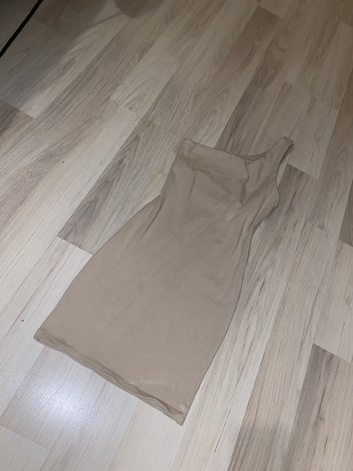 Bej renkte, yumuşak kumaştan yapılmış, tek omuzlu mini elbise. Vücuda oturan kesimiyle minimalist ve şık bir görünüm sunar.