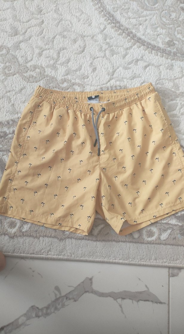 Bej renkli, düğmeli detaylı, bol kesim mini erkek şort. Pastel tonlarda, plajda kullanıma Erkekler için L bedenli yazlık deniz şort sorunsuz deformesizdir