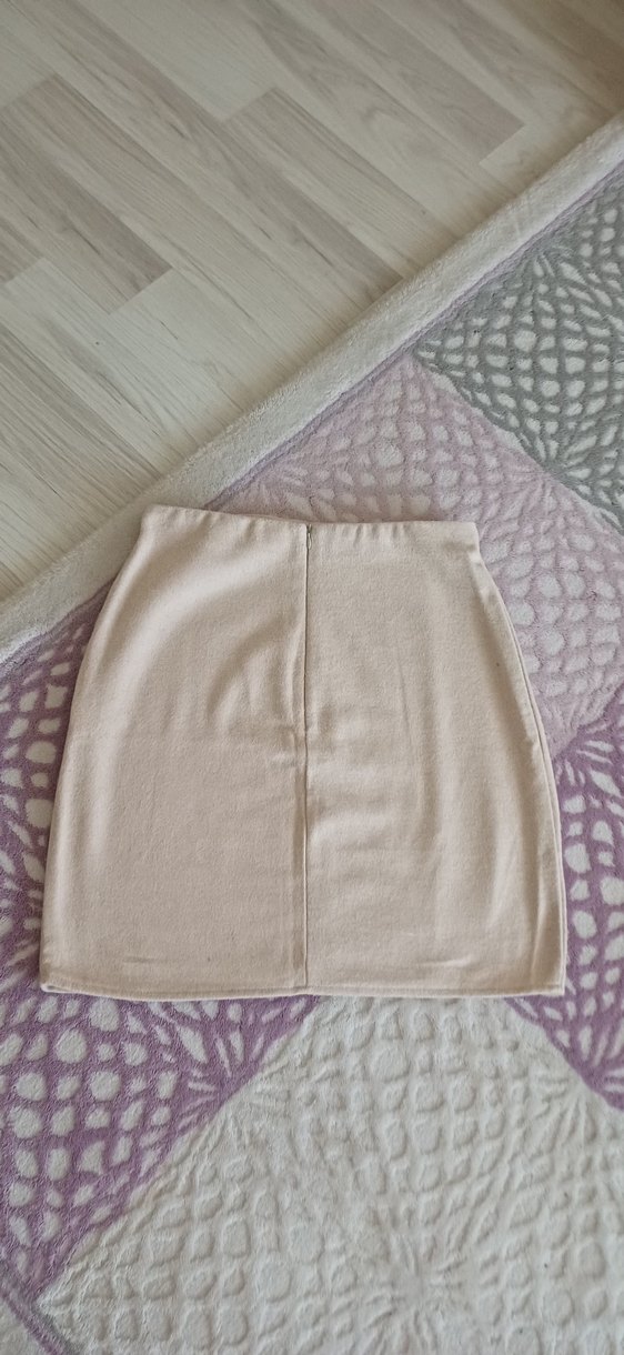 Yumuşak keten kumaştan yapılmış bej midi etek, bohem tarzda, rahat ve şık bir görünüm sunar.