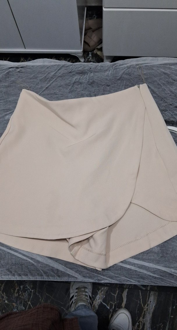 Bej renkli mini etek, rahat kesimi ve yumuşak sentetik kumaşı ile zahmetsiz şıklık sunar. Günlük sokak stili için uygundur.