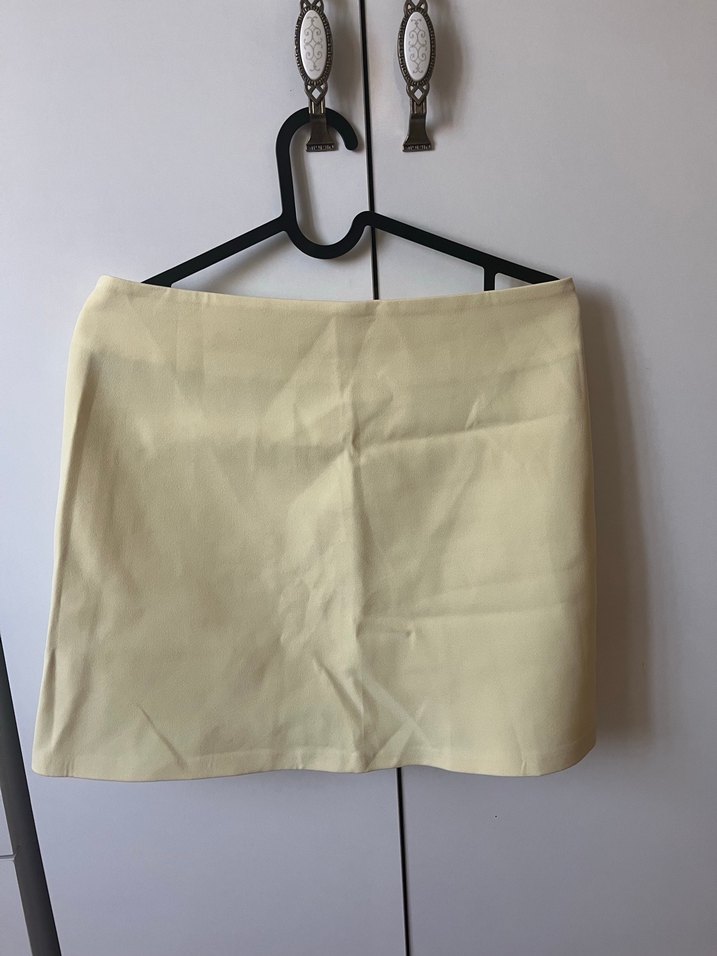 Bej renkli, sentetik kumaştan yapılmış, düz ve sade mini etek. Vücuda oturan modeli ve pastel tonu ile günlük sokak stiline uygun.
