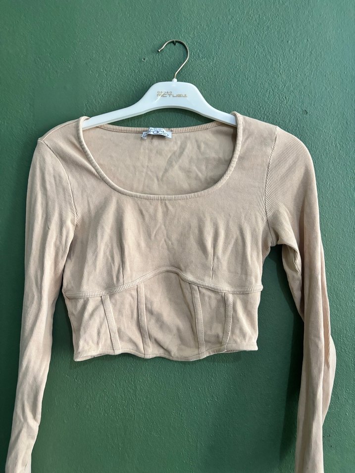Bej renkli, uzun kollu ve fit kesim keten bluz, yuvarlak yaka ve kısa boyuyla günlük sokak stiline uygundur.