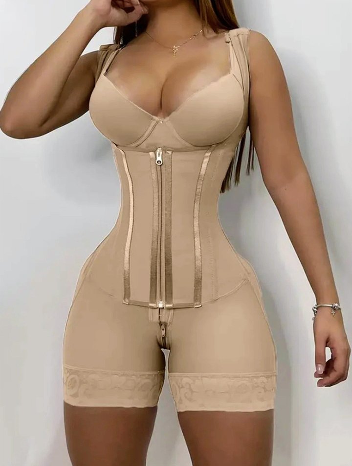 Bej renkte, kısa ve vücuda oturan hemşire korsesi. Önünde fermuar ve ayarlanabilir askılar bulunur.