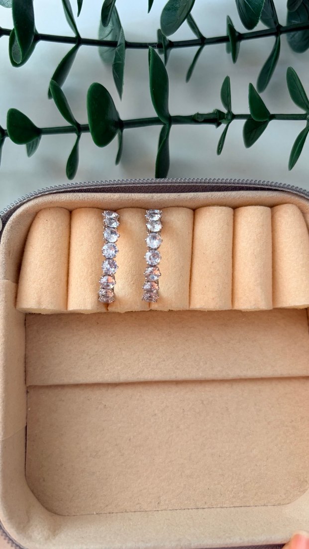 Kısa uzunlukta, işlemeli detaylara sahip bej küpeler, fermuarlı kutuda. Düğünler için çağdaş ve minimalist stilde. ✨