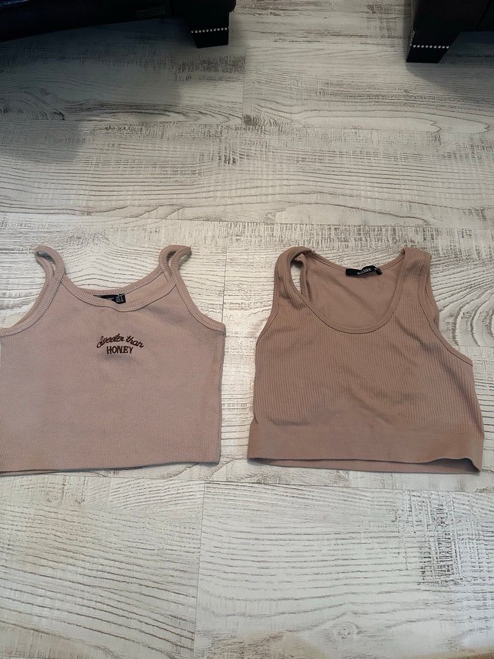 Bej renkli, pamuklu, fitted kesim iki kadın atlet. Biri küçük yazı işlemeli, rahat ve şık günlük kullanım için uygun.