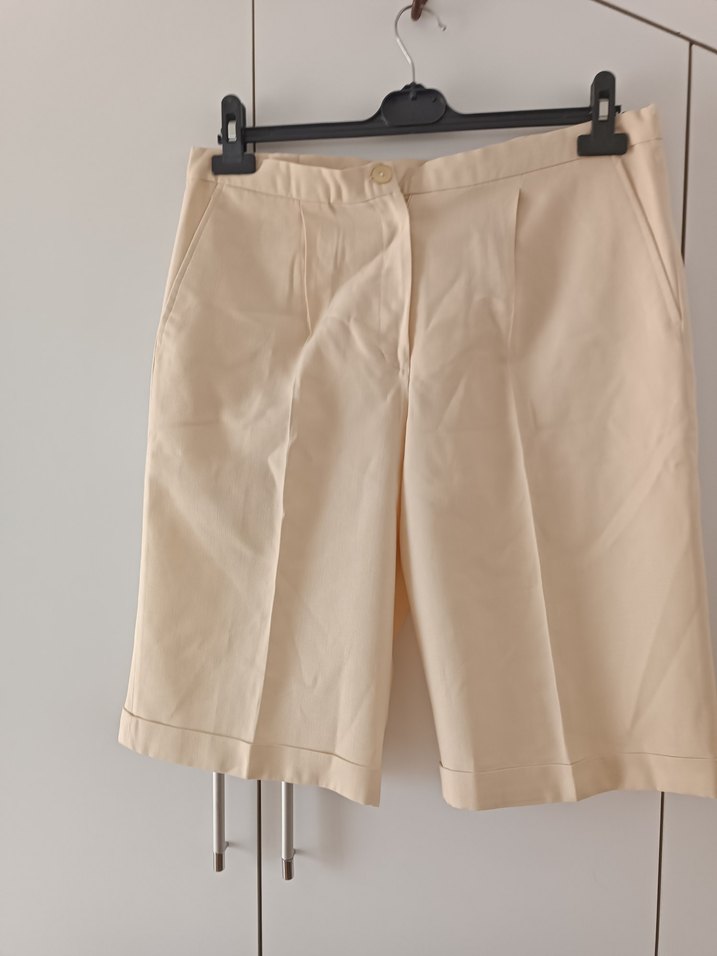 Bej renkli, mini boy, regular fit ve ipeksi dokulu kadın Bermuda şort. Desensiz ve pastel tonuyla ofis için sade, şık bir stil sunar. pamuklu keten