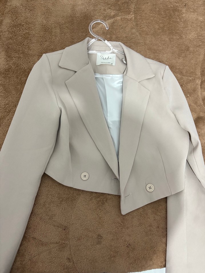 Bej renkli, çıtçıtlı ve kısa kesim kadın blazer ceket. Uzun kollu, regular fit ve desen içermeyen sentetik kumaştan üretilmiştir.