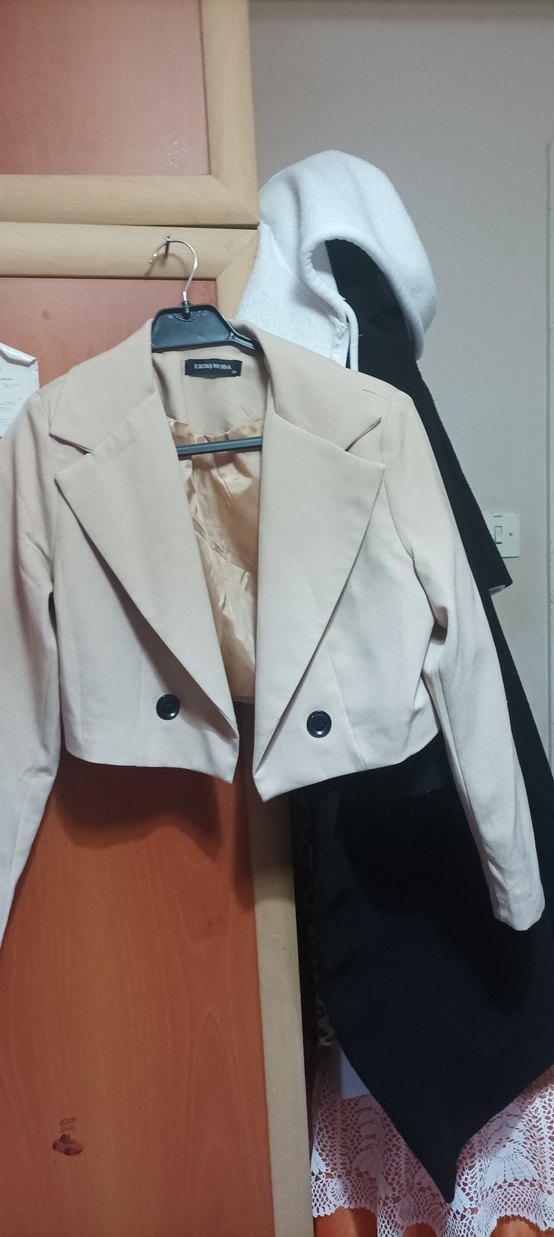 Bej renkli kadın blazer, kısa mini boy ve uzun kollu. Düğmeli, regular fit ve kesimli yakasıyla ofis ve sokak stiline uygun.