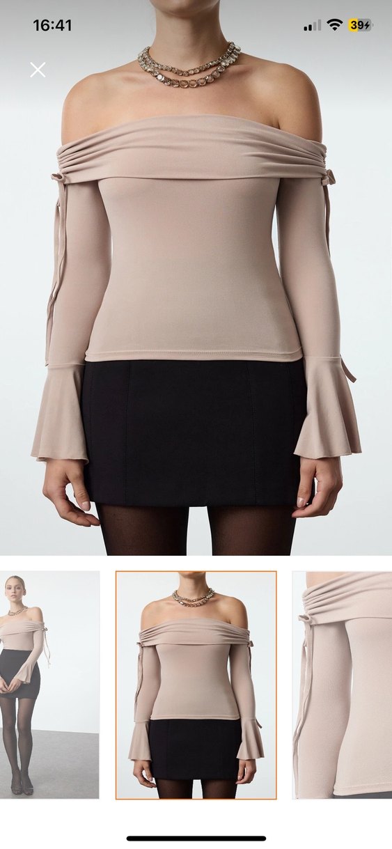 Bej renkli, kayık yaka ve uzun kollu, mini kesim kadın bluz. Düz, sade tasarımıyla ofis için şık ve rahat bir seçim. ✨