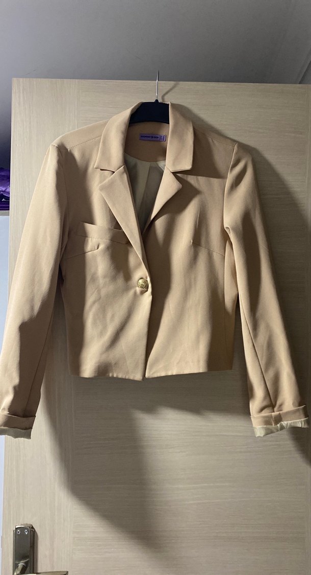 Bej renkte, düğmeli mini kadın ceket. Kısa boy, uzun kollu ve regular fit tasarıma sahip, yumuşak sentetik kumaştan üretilmiştir. Ofis ve günlük kullanıma uygundur.