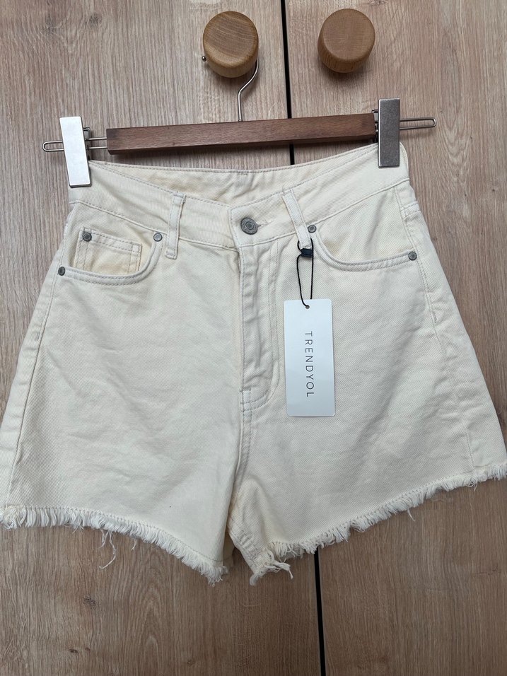Yumuşak pamuktan üretilmiş, salaş kesim bej mini denim şort. Günlük kullanım için uygun, salaş ve rahat bir sokak stili sunar. Uçları hafif yıpranmıştır.