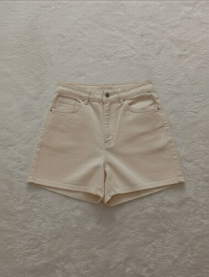 Bej renkte, pamuklu ve bol kesim mini kadın denim şort. Desensiz ve günlük kullanıma uygun sade tasarım.