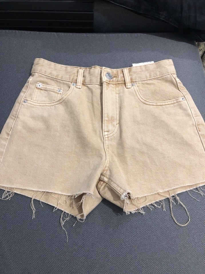 Bej renkli, bol kesim mini denim şort. Püsküllü kenarlarıyla günlük sokak stili için rahat ve trend bir görünüm sunar. Etiketli