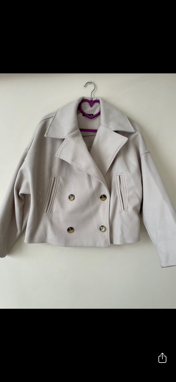 Bej renkli, kısa boylu kadın ceketi, düğmeli ve kesik yaka detaylıdır. Uzun kollu, bol kesim ve yumuşak dokuludur. Rahat sokak stili için uygundur.