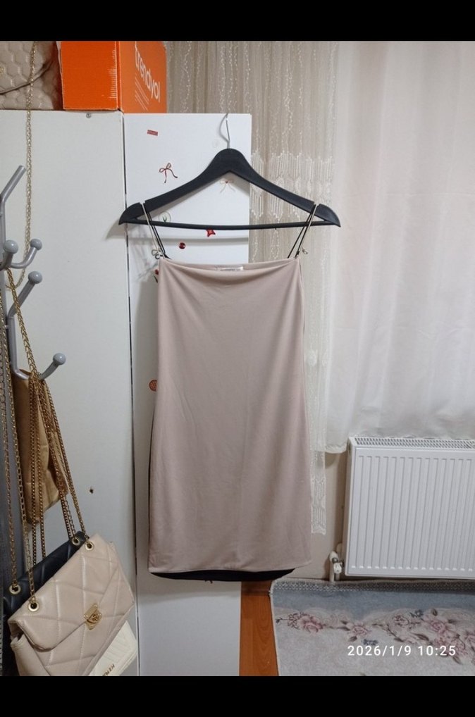 Bej renkli, ince askılı, straplez mini elbise. Sade ve şık tasarımıyla günlük ve sokak stiline uygundur. 90cm uzunluğunda s,m giyer