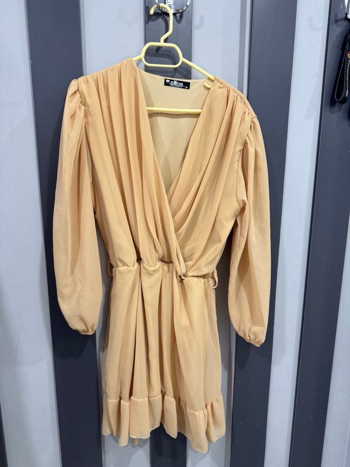 Bej renkte, uzun kollu, derin V yakalı, beli büzgülü ve fırfırlı etek uçlu bol kesim mini elbise. Paris tarzı sokak modasına uygun.