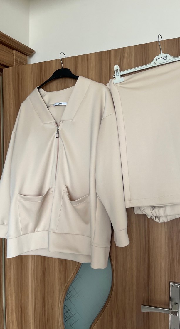 Kadınlar için bej renkli, kısa etekli ve fermuarlı uzun kollu üstten oluşan bol kesim eşofman takımı. Minimalist ve sade normcore tarzıyla, yumuşak sentetik kumaştan günlük kullanım için uygundur.