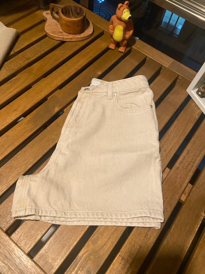 Bej renkte, pamuklu kumaştan yapılmış, bol kesim mini kot şort. Günlük kullanım için rahat ve şık bir sokak stili sunar.