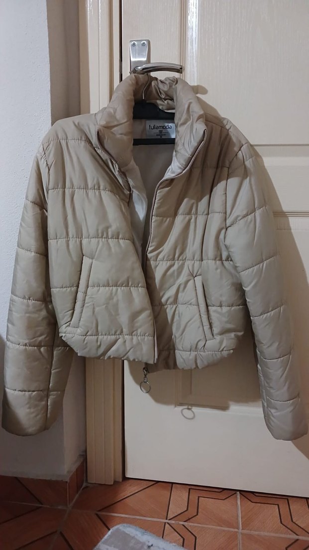 Bej renkli, kısa kesim kadın mont, düğmeli ve yakalıdır. Yumuşak ve sıcak kumaştan üretilmiş, rahat sokak stili için uygundur.