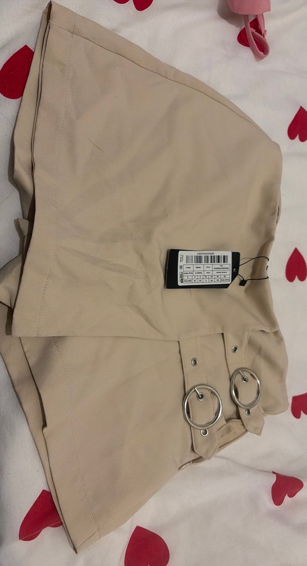 Bej mini şortlar, sıkı kesim ve tokalı detaylara sahiptir, günlük sokak stili için uygundur. Bedeni büyük geldiği için satılıyor S beden