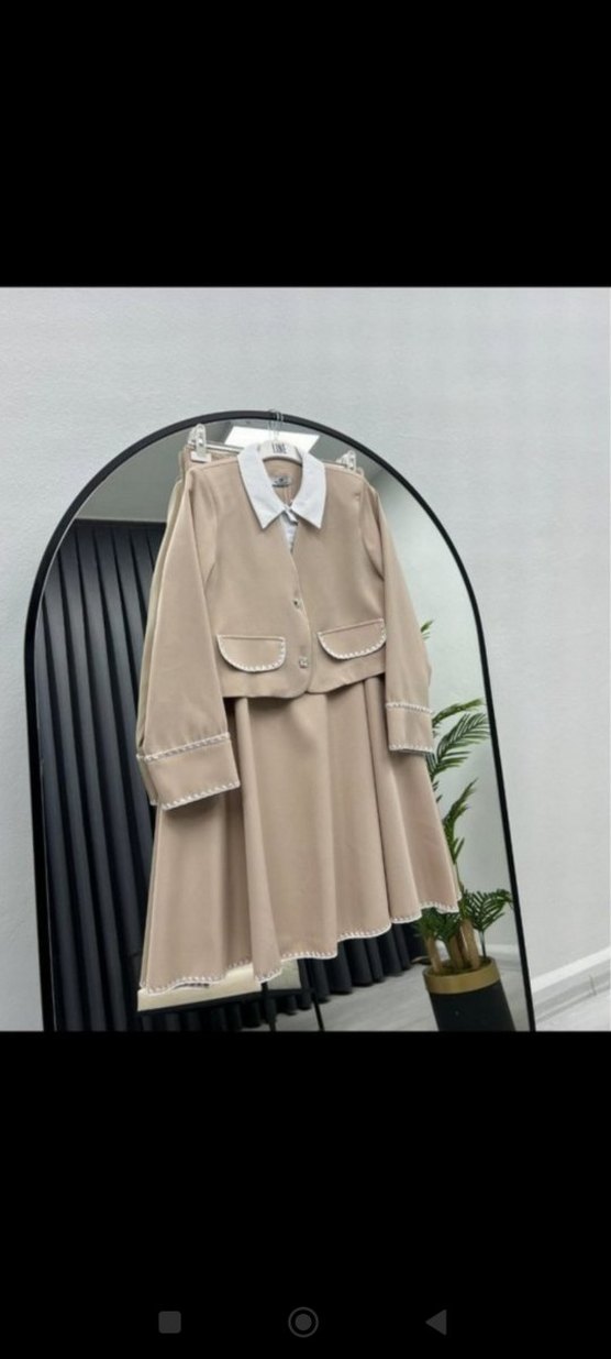 Bej renkte, kısa etekli ve düğmeli ceketli kadın takımı. Uzun kollu, sentetik kumaştan, modern klasik tarzda ofis kullanımı için uygun.