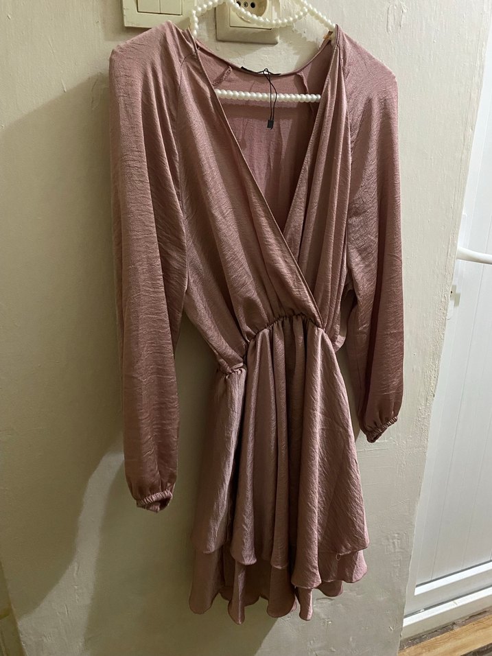 Uzun kollu, bol kesim bej mini elbise, yumuşak dokulu ve bohem Paris esintili. Desensiz sade tasarım.