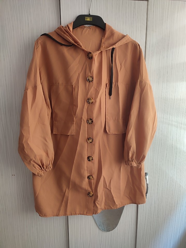 Bej renkte, düğmeli, uzun kollu, mini boy ve bol kesim kadın yağmurluğu. Sentetik kumaştan üretilmiş, günlük sokak stili için uygundur. ️