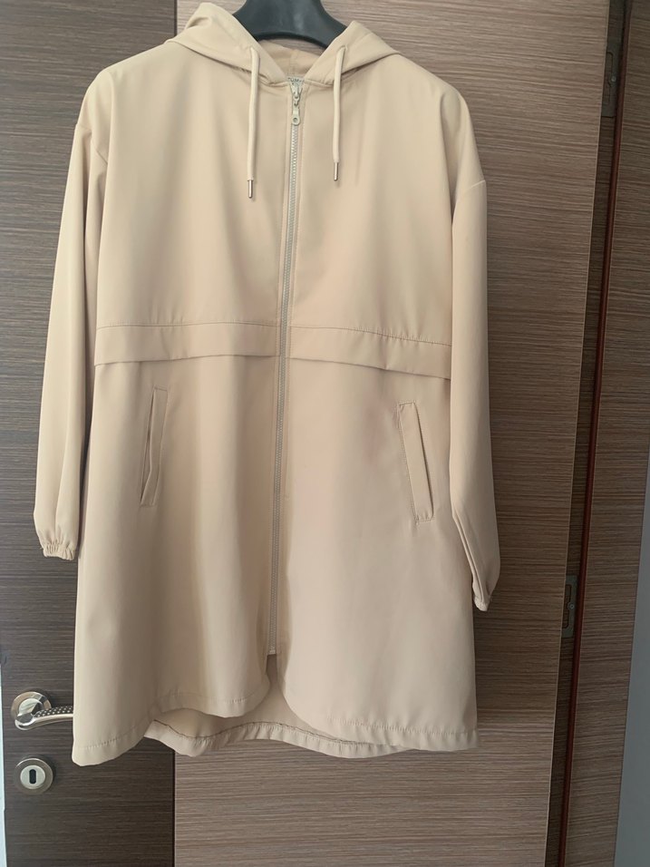 Bej renkli, kısa ve bol kesim kadın yağmurluğu. Fermuarlı ön, kapüşonlu ve uzun kollu, minimalist sokak stiliyle günlük kullanıma uygun. Beden büyük geldiği için satıyorum denemek için bir kere giyildi