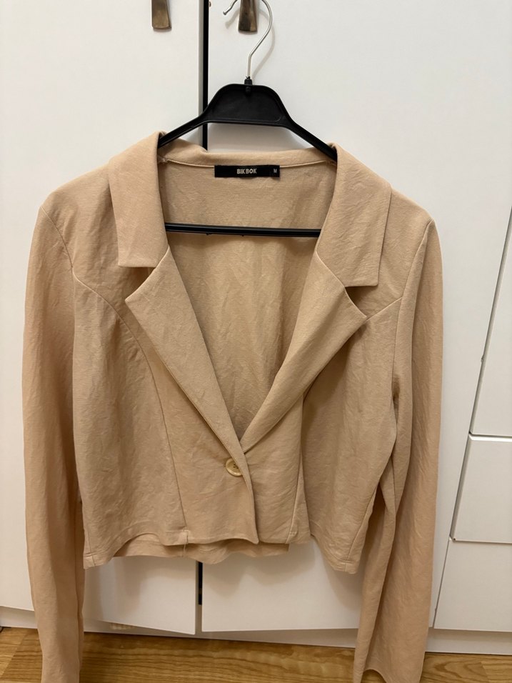 Bej renkli, keten kumaş formunda astarsız mini blazer. Yaka kısmı kesik ve düğmeli, uzun kollu, regular fit. Ofis ve günlük kullanıma uygun. Hiç giyilmedi.