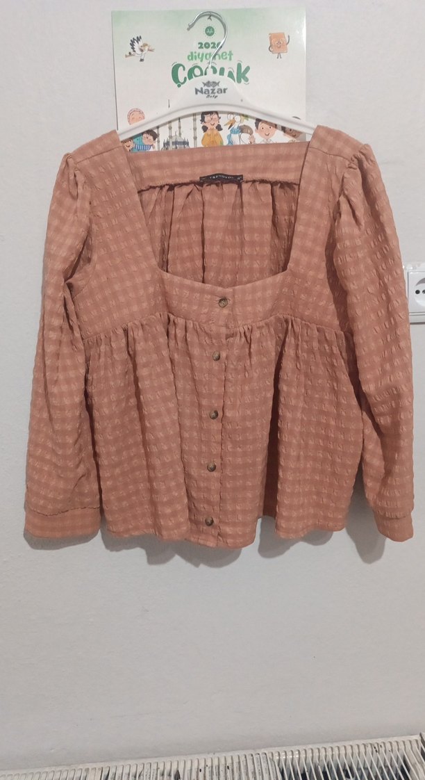 Bej renkli, keten kumaştan, düğmeli ve uzun kollu mini bluz. Salaş kesimi ve tekne yaka detayıyla günlük kullanıma uygun bohem tarzda.