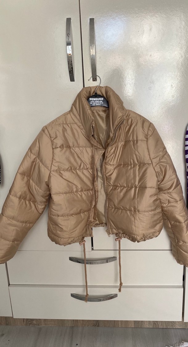 Bej renkli, parlak kısa kadın kışlık mont, yüksek yaka ve düğmeli kapama ile. Uzun kollu, dar kesim ve sentetik kumaştan, günlük sokak stiline uygun. ❄️