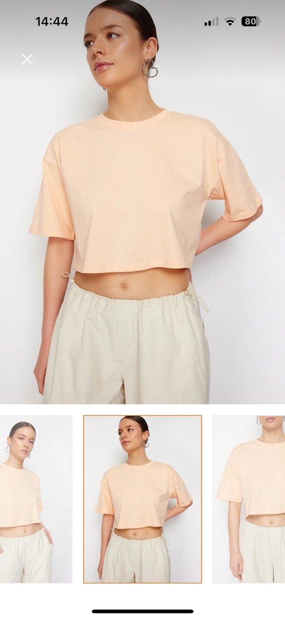 Bej renkte, kısa kollu, yuvarlak yakalı mini ve bol kesim pamuklu tişört. Rahat ve günlük kullanıma uygun.