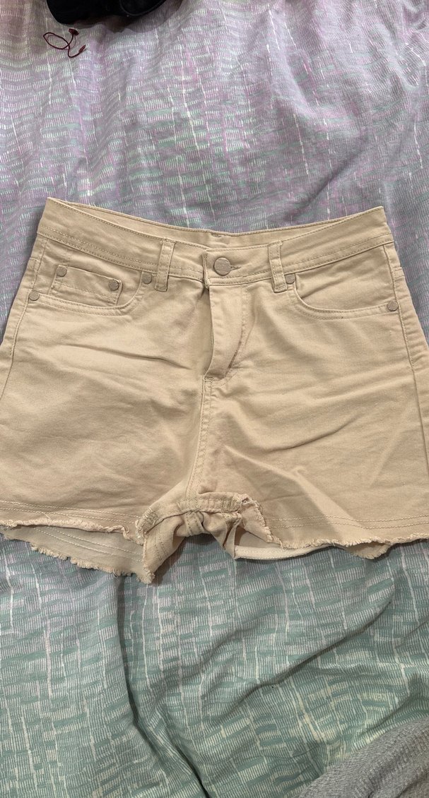 Pamuklu kumaştan yapılmış, rahat kesimli bej mini kot şort. Desensiz, günlük kullanım için rahat ve şık bir sokak stili sunar.