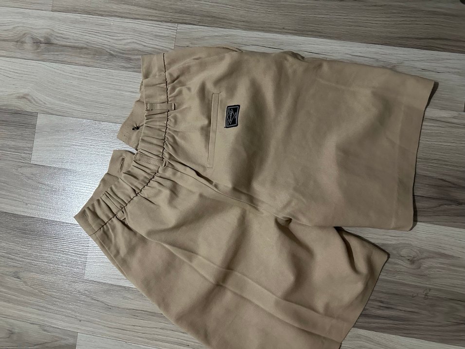 Bej renkli, keten kumaştan mini boy, bol kesim kadın pantolon. Düğmeli detay ve lastikli bel ile rahat kullanım sağlar. Günlük rahat kombinlere uygun.