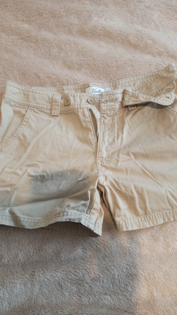 Pamuklu, düğmeli kapamalı, düz bej mini şort, rahat günlük kullanım için uygun ve sokak tarzına uyumlu.