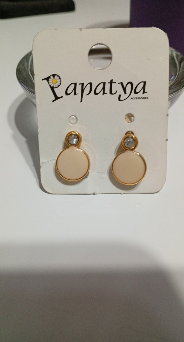 Bej renkli, parlak yüzeyli ve baskılı desenli mini küpeler, günlük kullanıma uygun minimalist ve çağdaş tarzdadır.