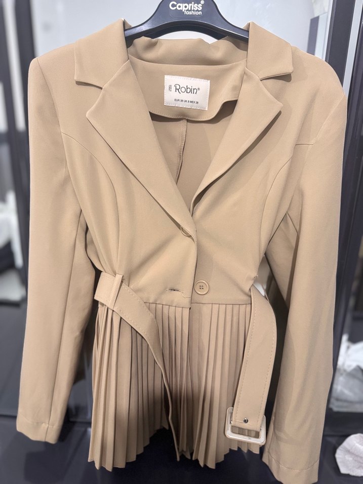 Bej renkli, pilili mini etek detaylı kadın blazer ceket. Kemerli beli ve kesik yaka tasarımıyla, sentetik kumaştan üretilmiştir. Ofis ve sokak stili için uygundur.
