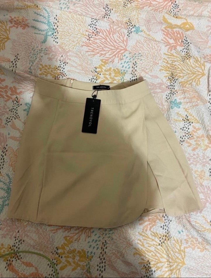 Bej renkli, pilili ve bol kesim mini etek. Yumuşak sentetik kumaştan üretilmiş, minimalist ve günlük şıklık için uygun.