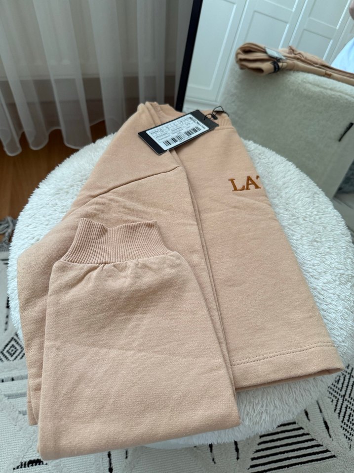Yumuşak ve rahat kumaştan yapılmış, bol kesim bej mini eşofman. 'LA' detaylı sade tasarım, günlük kullanım için uygun. Hiç giymedim etiketi dahi üstünde duruyor