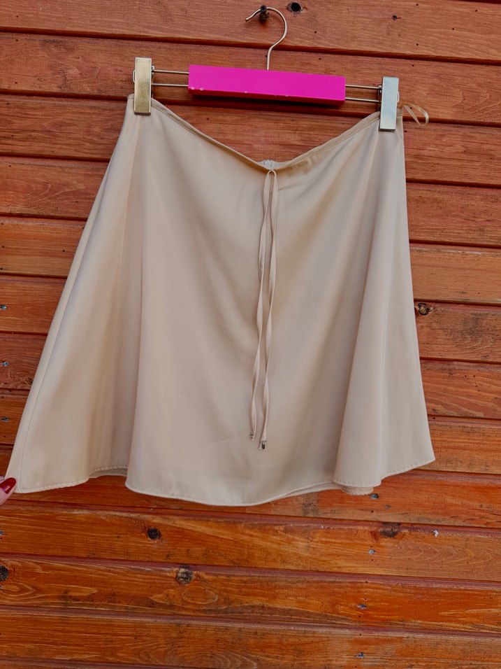 Bej renkte,kloş saten etek. Yumuşak sentetik kumaştan, minimal bohem tarzda, açık hava kullanımı için uygundur.