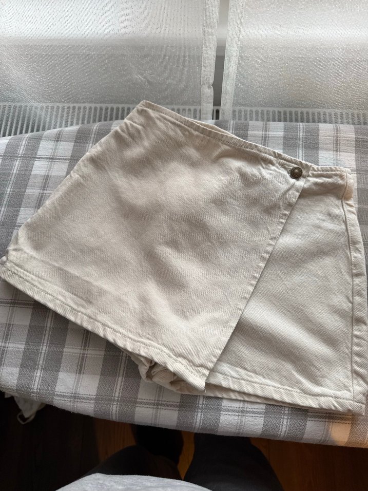 Bej mini şort, bol kesim ve sade tasarımıyla günlük kullanıma uygundur. ✨