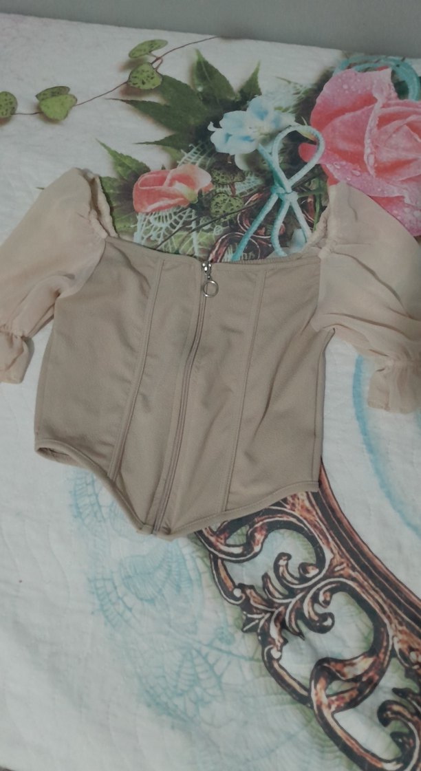 Bej renkli, straplez yaka ve ön fermuarlı mini kesim bluz. Yumuşak sentetik kumaştan, askılı kollarıyla günlük kullanıma uygun.