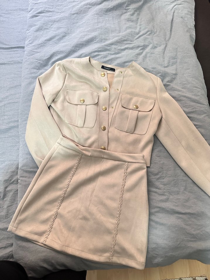 Bej renkte, süet kumaştan mini uzun kollu kadın takımı. Düğmeli ve yakalı, cep detaylı, ofis için uygun şık bir parça.