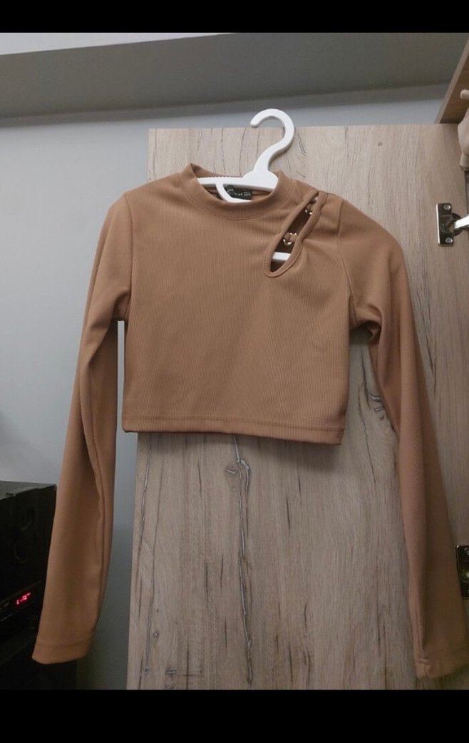 Bej renkli, kısa kesim ve dar kesim kadın sweatshirtü, uzun kollu ve yuvarlak yakalıdır. Süet dokulu yumuşak kumaştan yapılmış olup, yakada tokalı detay içerir. Günlük rahat kullanım için uygundur.