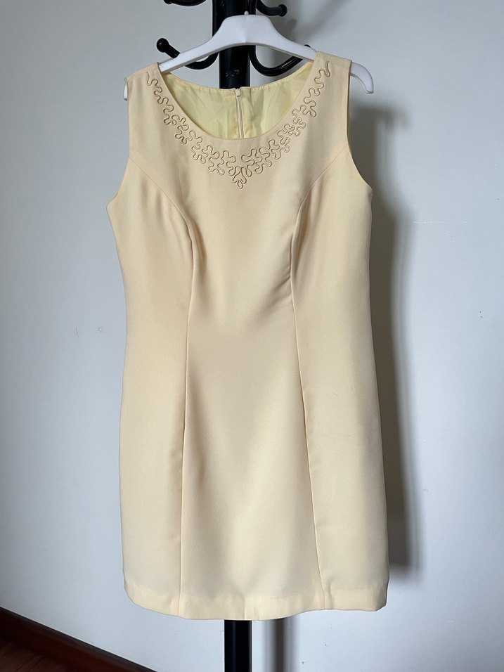 Kolsuz, V yakalı bej mini elbise, işlemeli ve boncuk detaylı, düğünler için modern klasik tarzda.