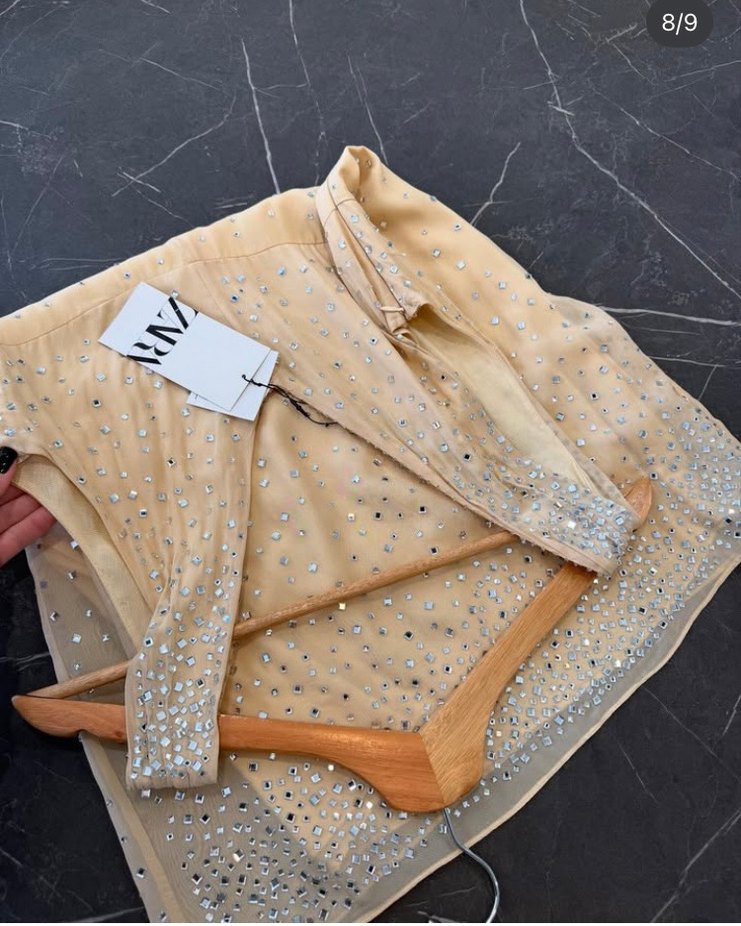 Bej renkte, V yakalı, uzun kollu mini elbise. Parlak payetler ve nakış detaylarıyla süslenmiş, düzenli kesim ve kısa boyda, düğün gibi özel anlar için uygun. ✨