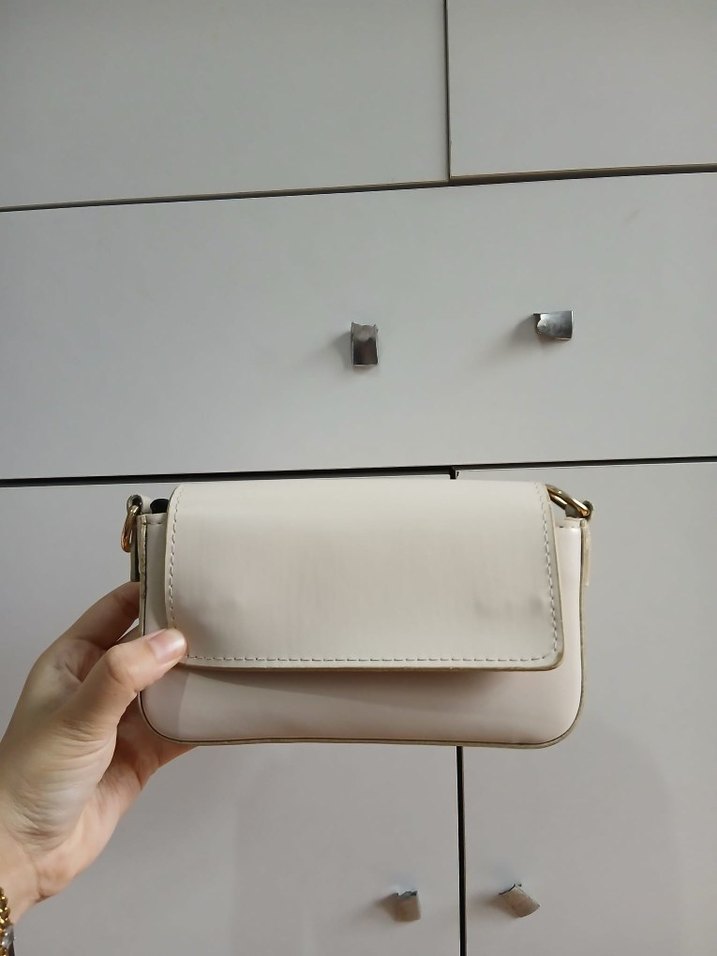 Bej renkli deri kadın çanta, minimalist ve modern klasik tarza sahiptir. Düz yüzeyi ve şık tasarımıyla günlük kullanıma uygundur. uzun askısı mevcurtur.