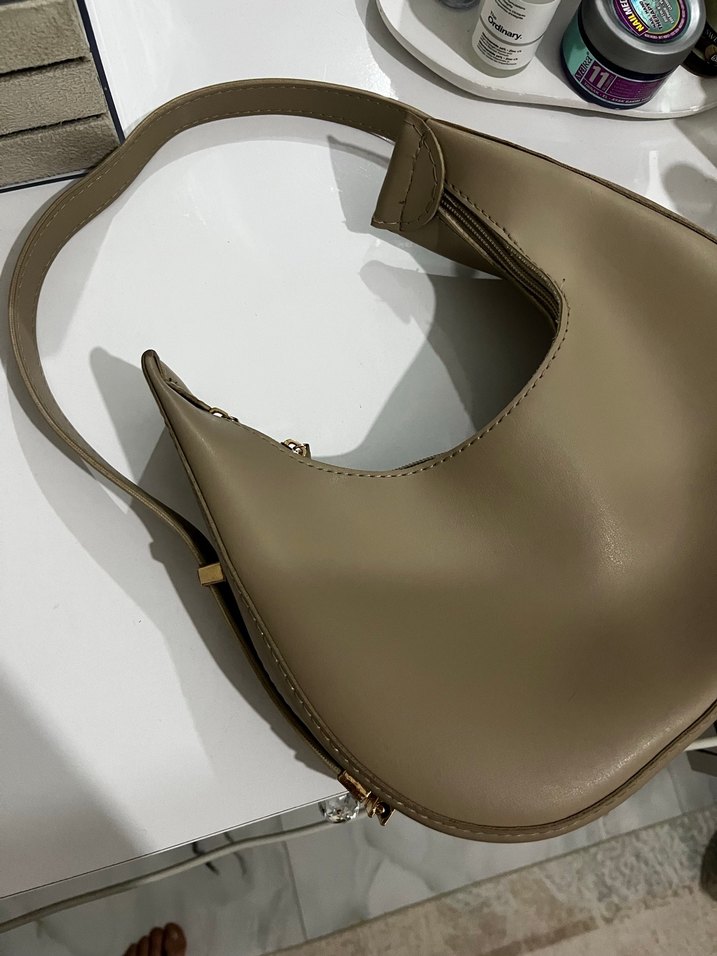 Bej renkte, fermuarlı kapamalı minimalist deri kadın çantası. Günlük kullanıma uygun çağdaş tasarım.