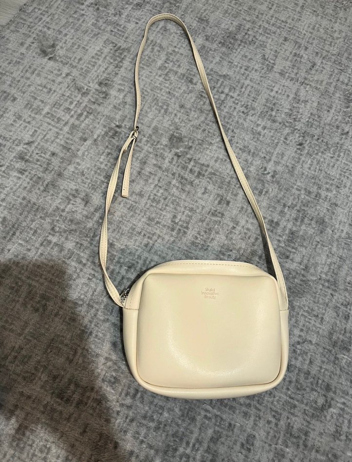 Bej pastel tonlarda, deri malzemeden yapılmış minimal ve desensiz çapraz çanta. Günlük kullanıma uygun, rahat ve şık bir sokak stili parçası.