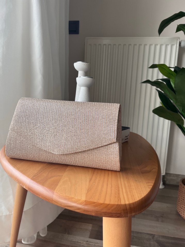 Bej renkli, desenli ve tokalı kadın portföy çanta. Yumuşak sentetik kumaştan, minimalist tarzda, klasik şıklık için uygun.